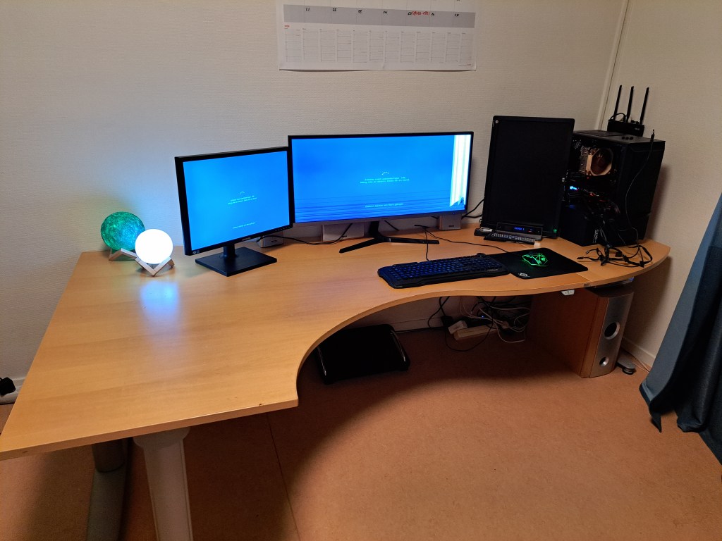 Bordsskivan är inte grovt skadad, men har någon liten repa på sig. Skrivbordet är delat i tre delar, som går att flytta runt för optimal form.